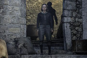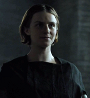 The Waif fights against Arya with staffs in the temple. She defeats her foe easily; at a certain point, she lays down her weapon. However, the Waif still manages to outmanoeuvre Arya and punches her to the ground announcing that "Lady Stark" will never be one of them. Jaqen enters soon afterwards, and the Waif takes her leave.[8] The Waif is then sent by Jaqen to keep an eye on Arya as she is tasked with assassinating Lady Crane. After finding that Arya has failed, the Waif has a conversation with Jaqen, suggesting that they came to a deal allowing the Waif to kill Arya for her failure. After hearing Jaqen's request to kill Arya humanely, the waif sets out to fulfill her mission.[9]